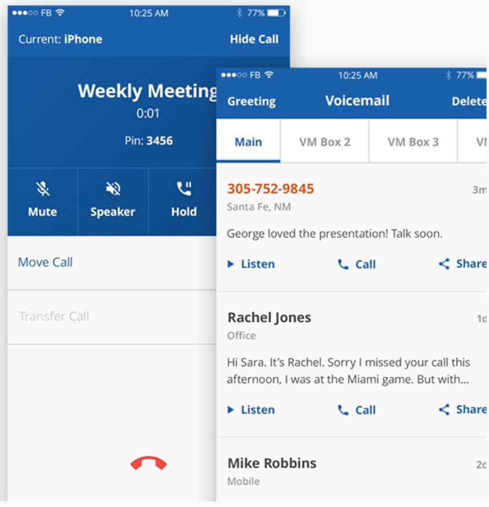 Modern employees need easy ways to connect and work from wherever they are, at any time. Whether they’re in the office, at home, or on the road, our fully integrated mobile app is perfect for making and taking calls, checking voicemail, SMS text messaging and much more.